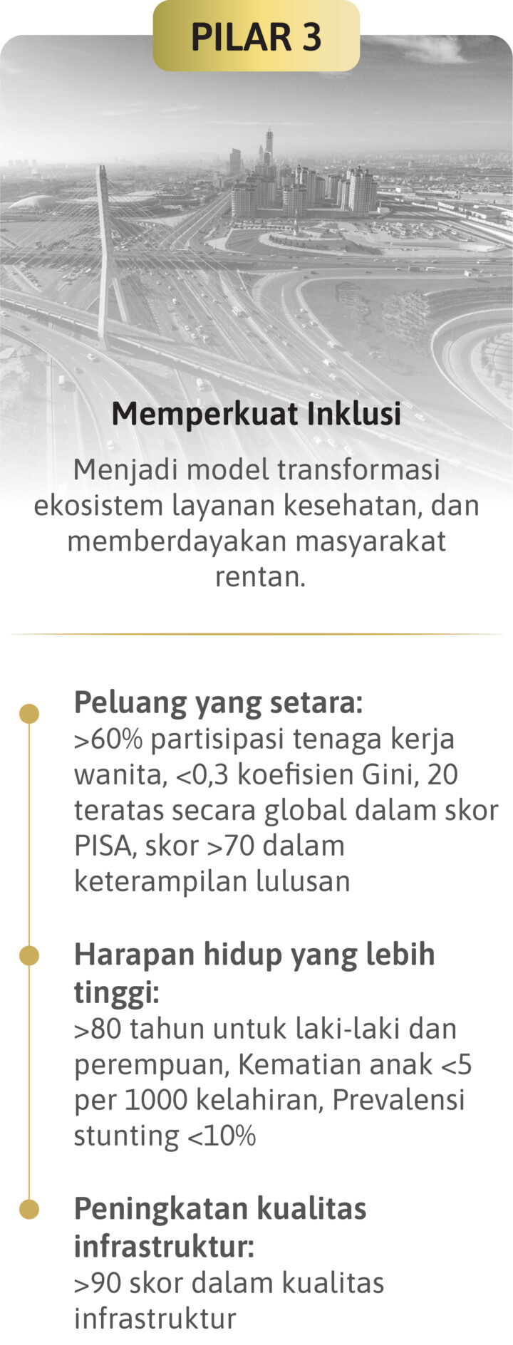 Untuk menjadi negara maju dan lepas dari jebakan negara kelas menengah, Peta Jalan ini merumuskan 4 pilar strategis untuk mencapai tujuan tersebut, antara lain: